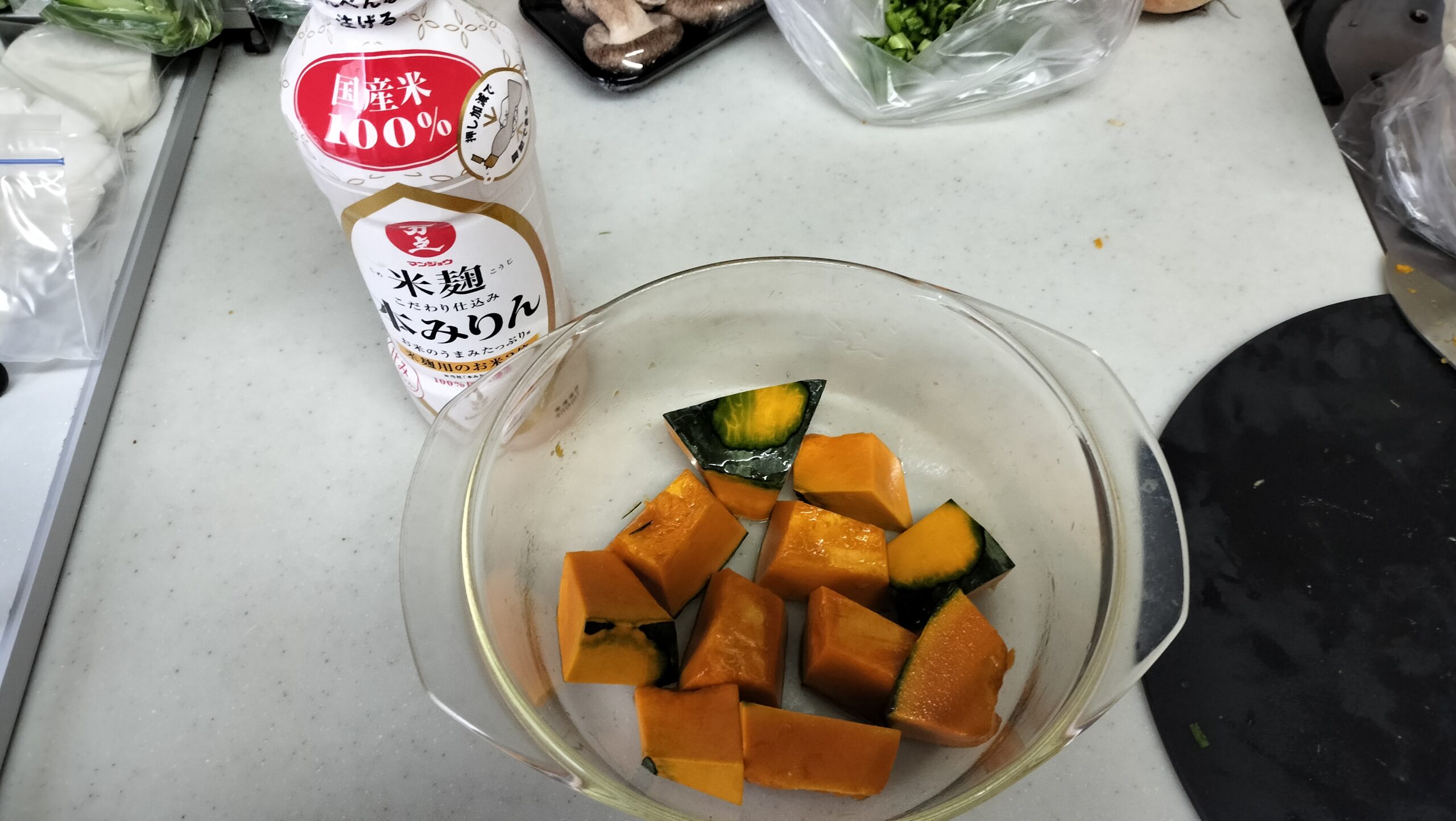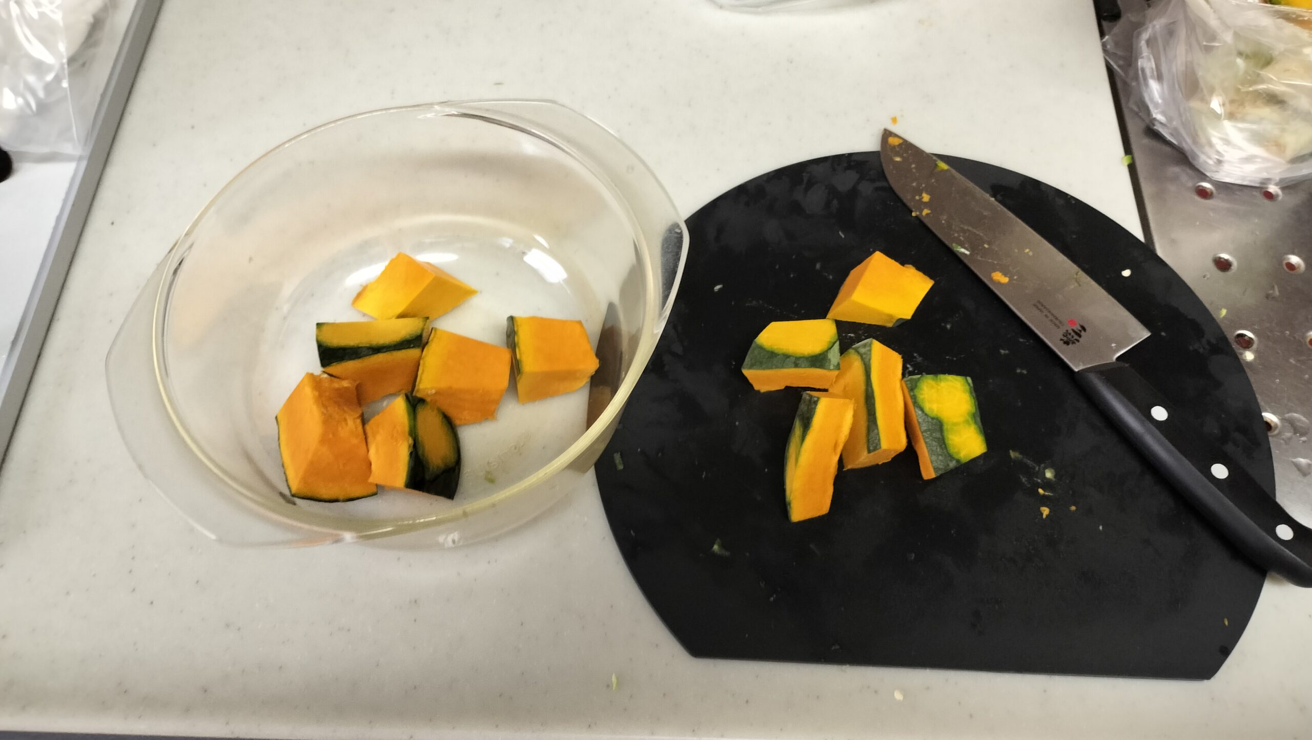 かぼちゃは切った後電子レンジで調理します。