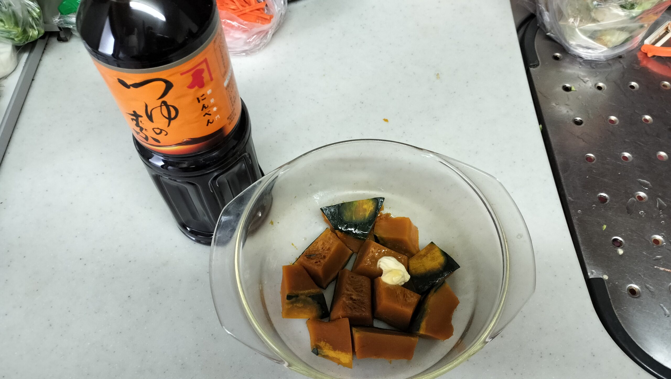 。かぼちゃに火が通ったらバター、めんつゆで味をつける。