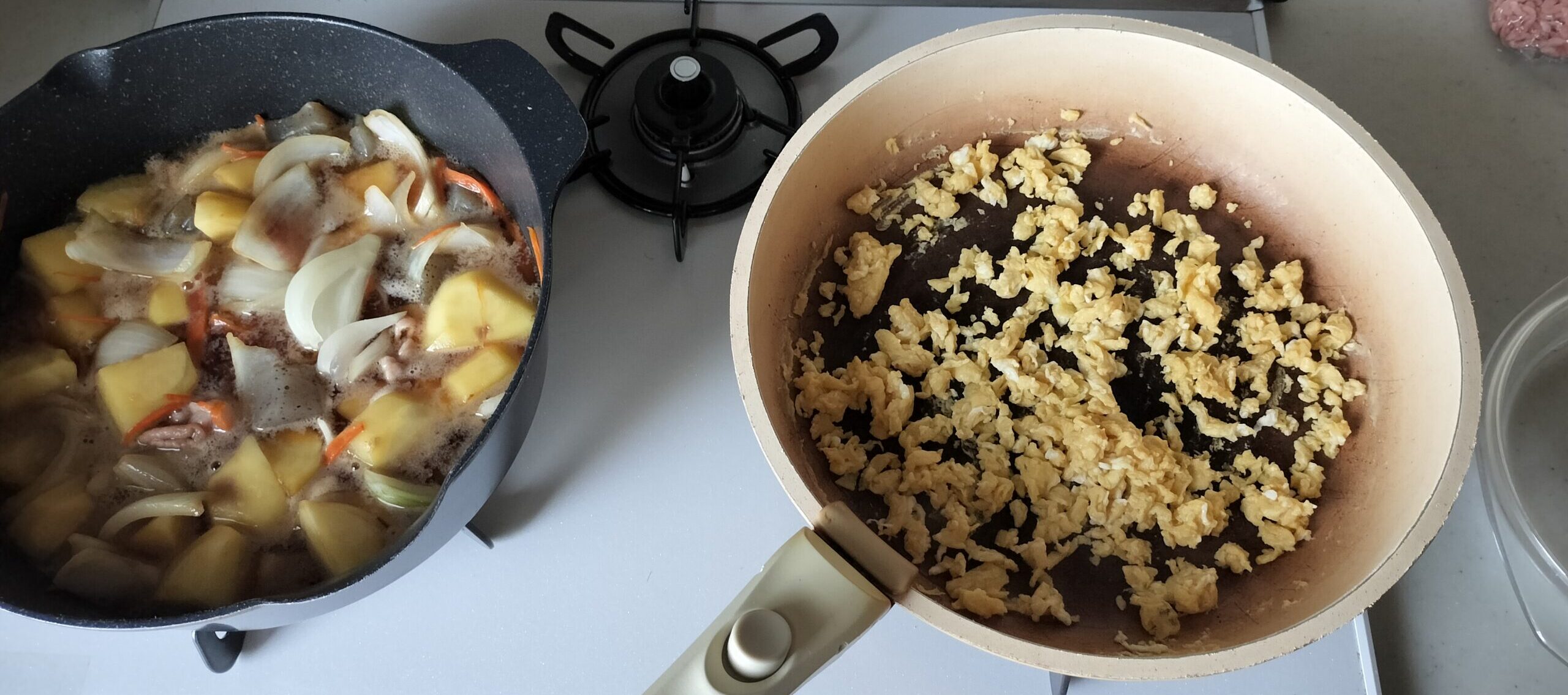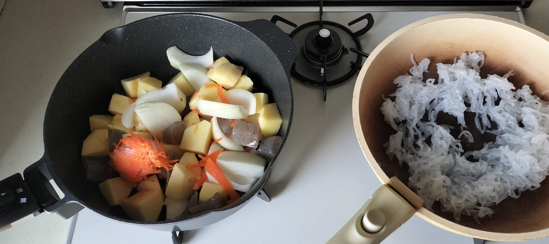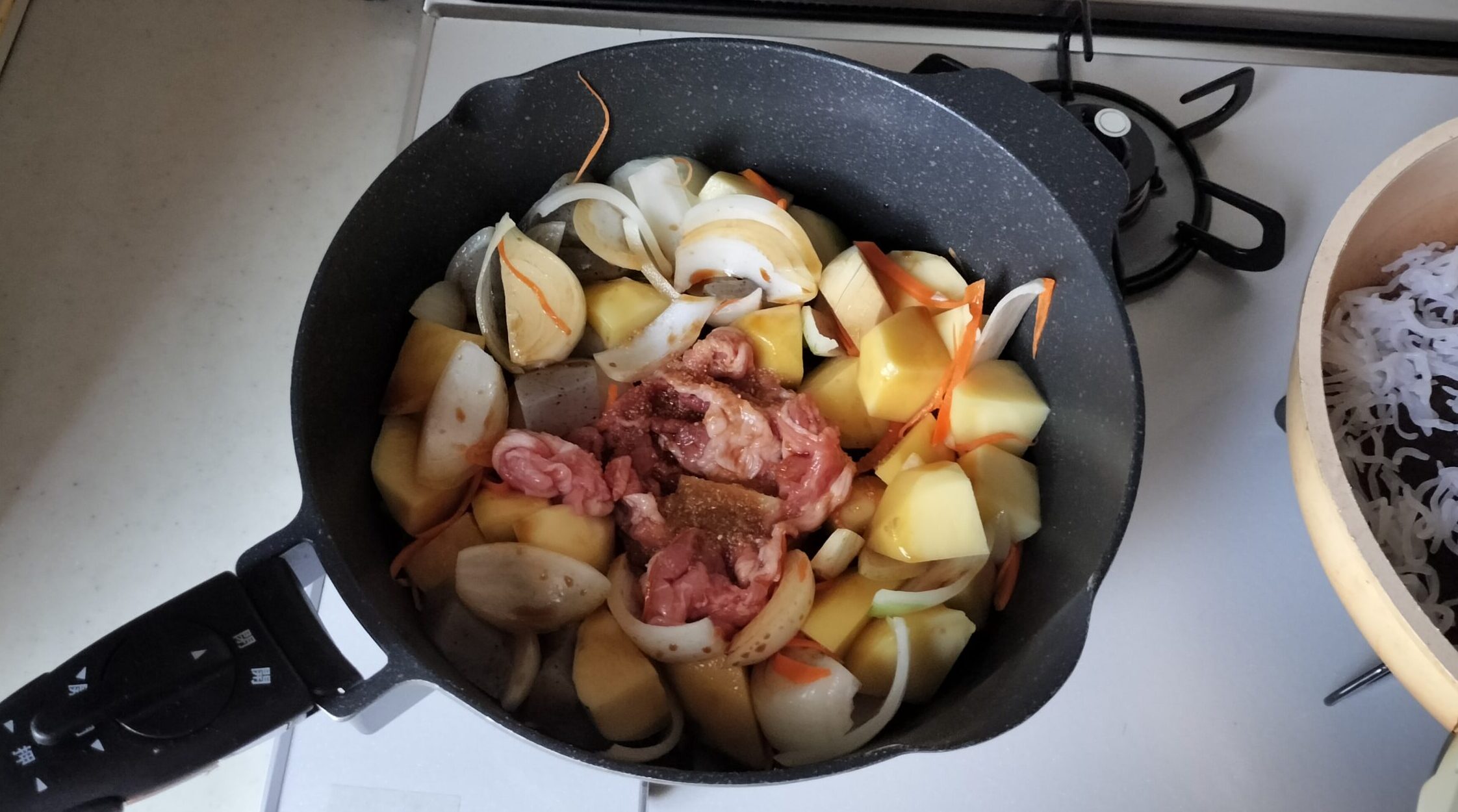 ・肉じゃがに水を入れ蓋をして煮込みます。
