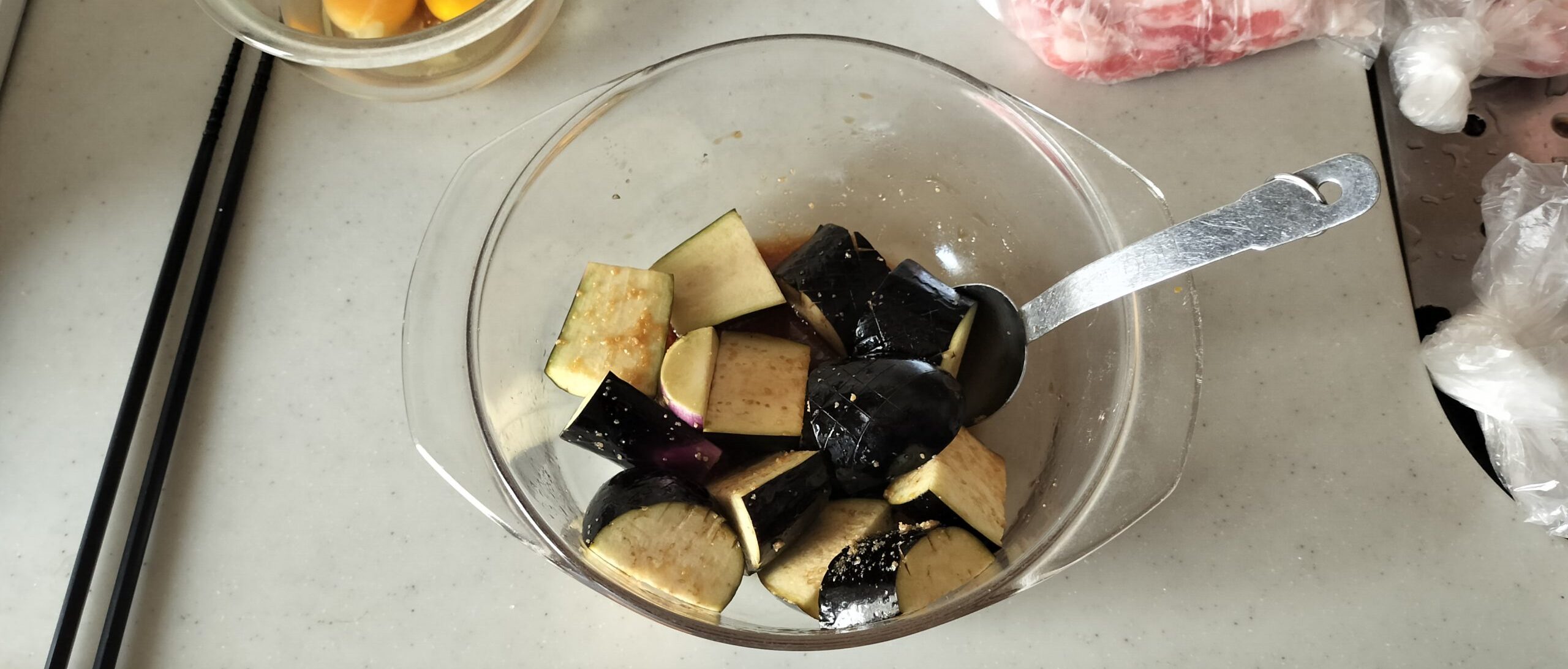 ・煮びたし用のナスをボウルに入れて調味料を混ぜておきます。