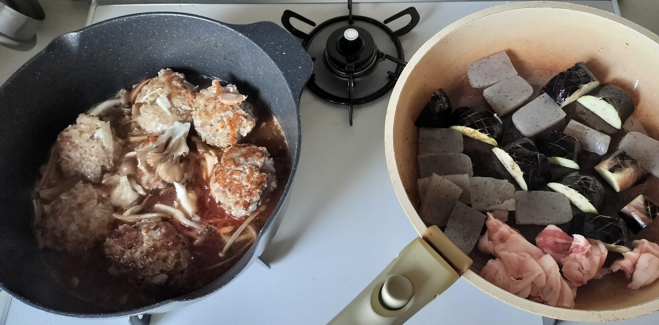 焼き目が着いたら調味料、水、きのこを入れて煮込みます。