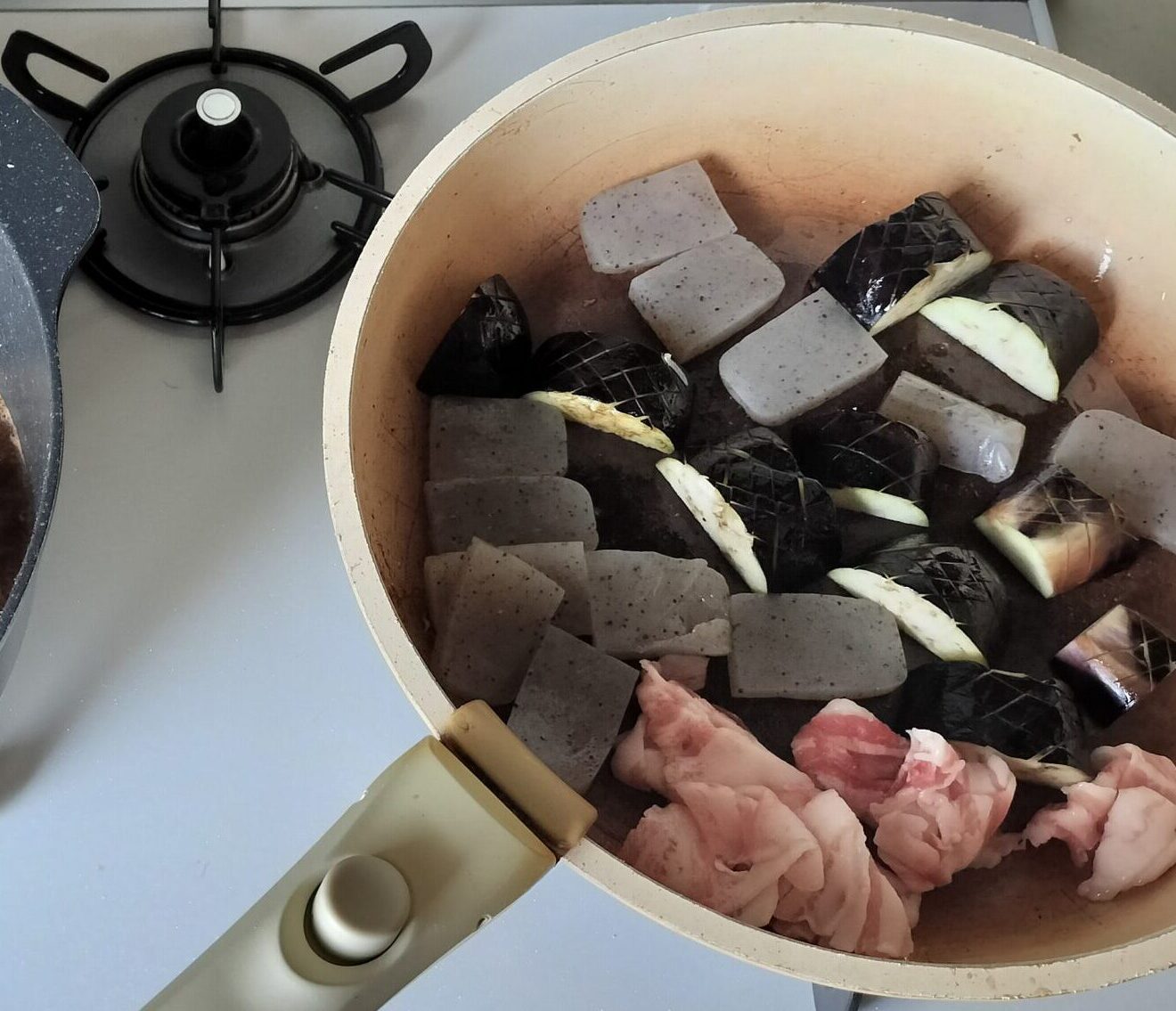 ・ナスとこんにゃくのみそ炒めの材料をフライパンに入れて炒めます。