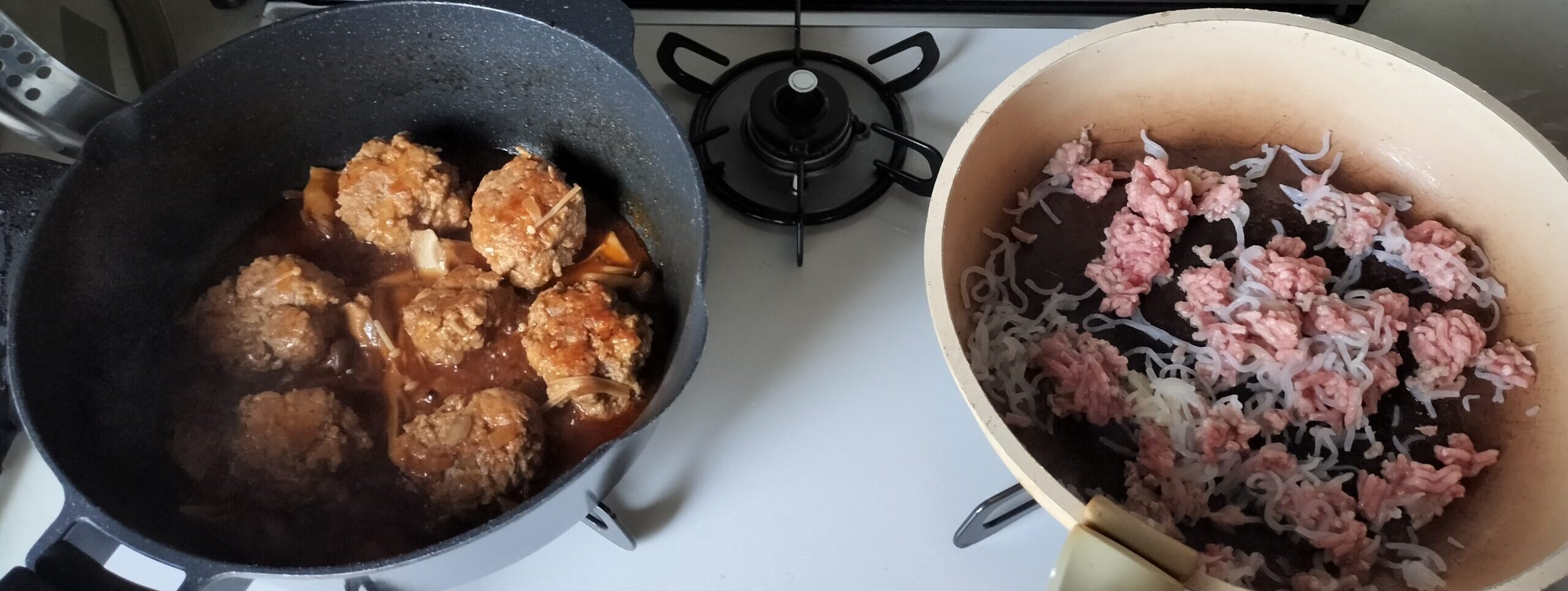 ・肉じゃがで使ったフライパンで煮込みハンバーグのタネを成形します。
