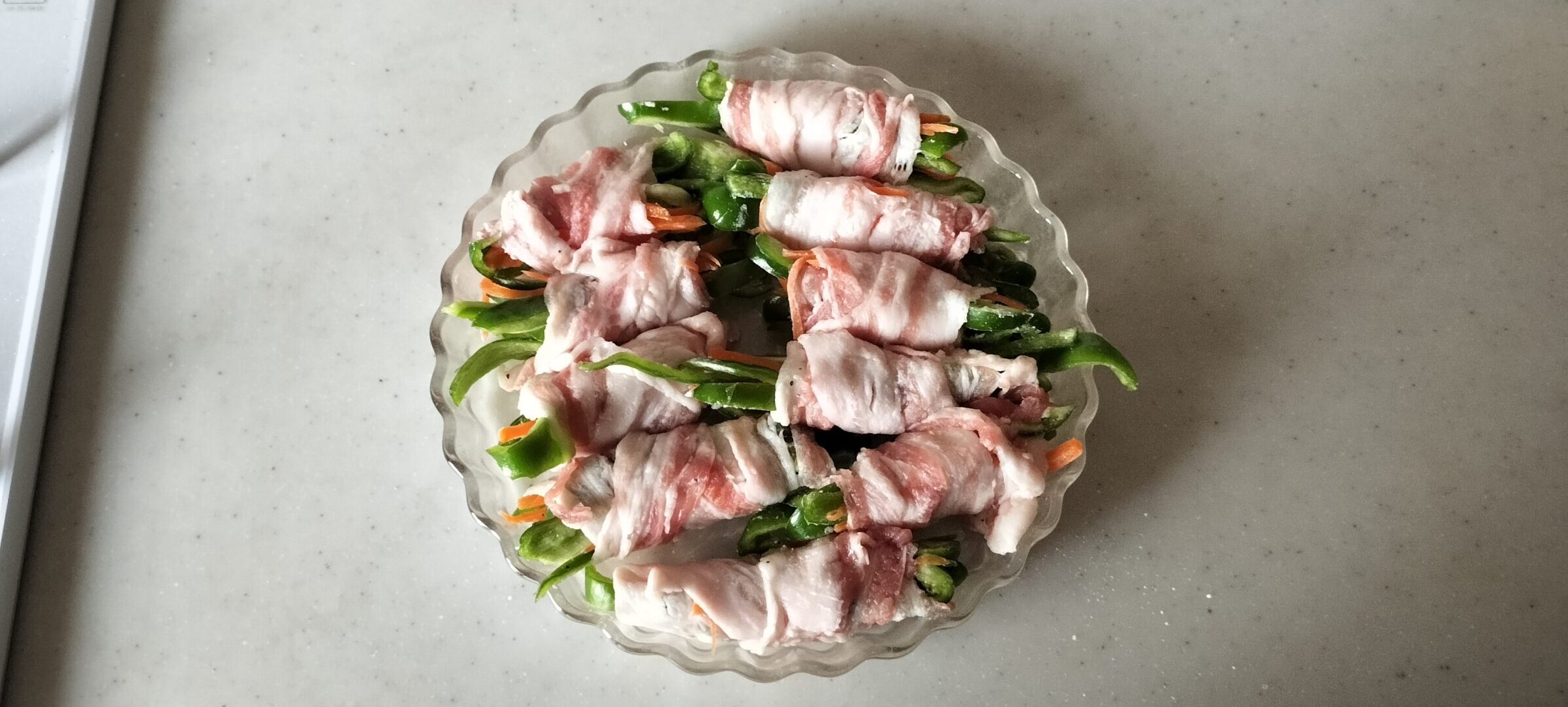 ピーマンとにんじんを豚バラ薄切り肉で巻いて酒を振りかけて