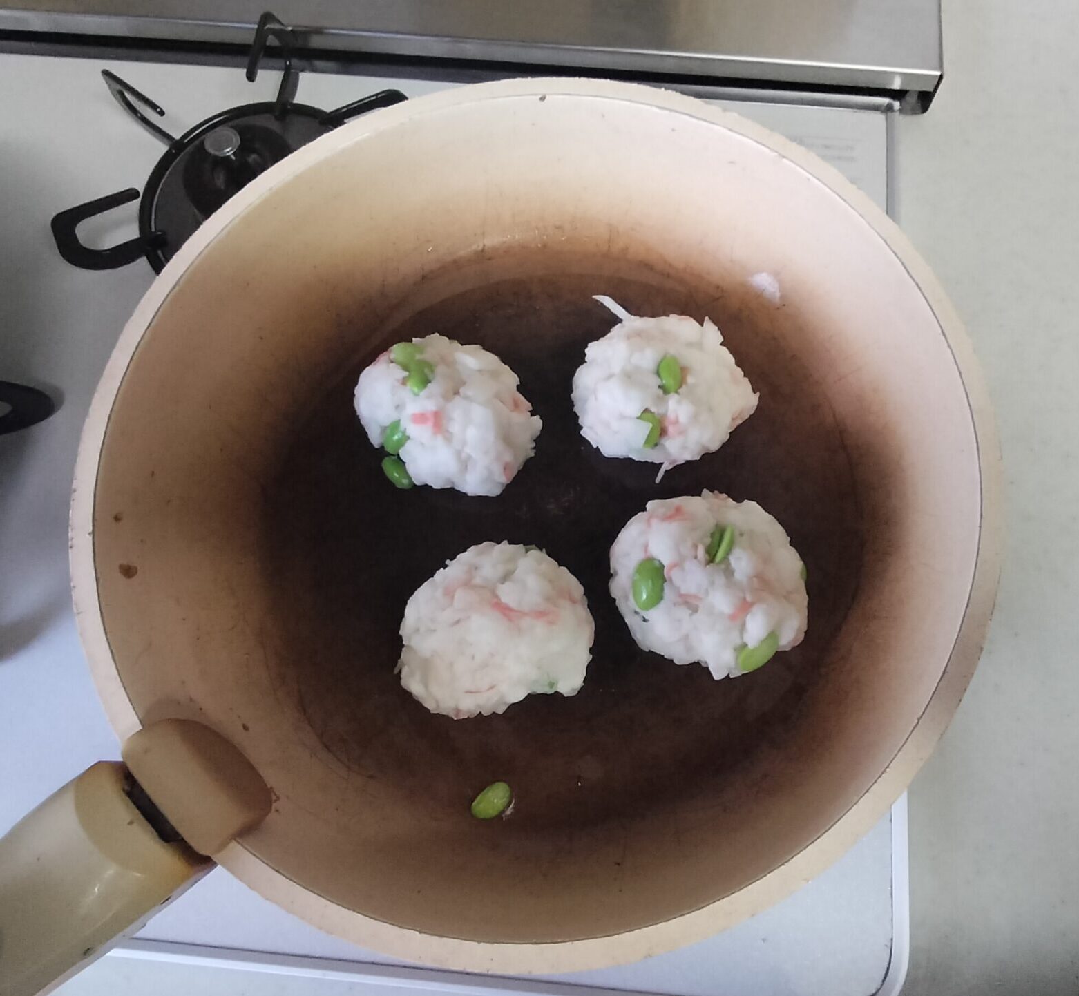 フライパンをサッと洗って拭き油をひいて成形したはんぺんバーグを蒸し焼きにします。