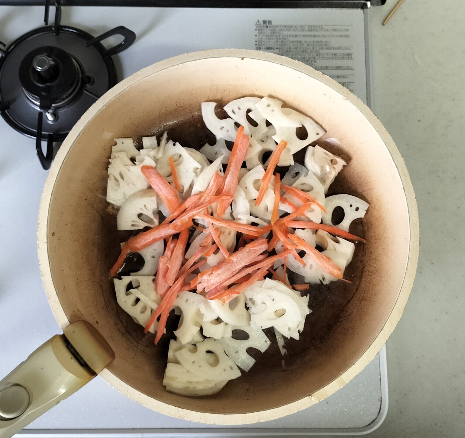 フライパンをペーパー等でサッと拭いてごま油をひきれんこんとにんじんを入れきんぴらを作ります。