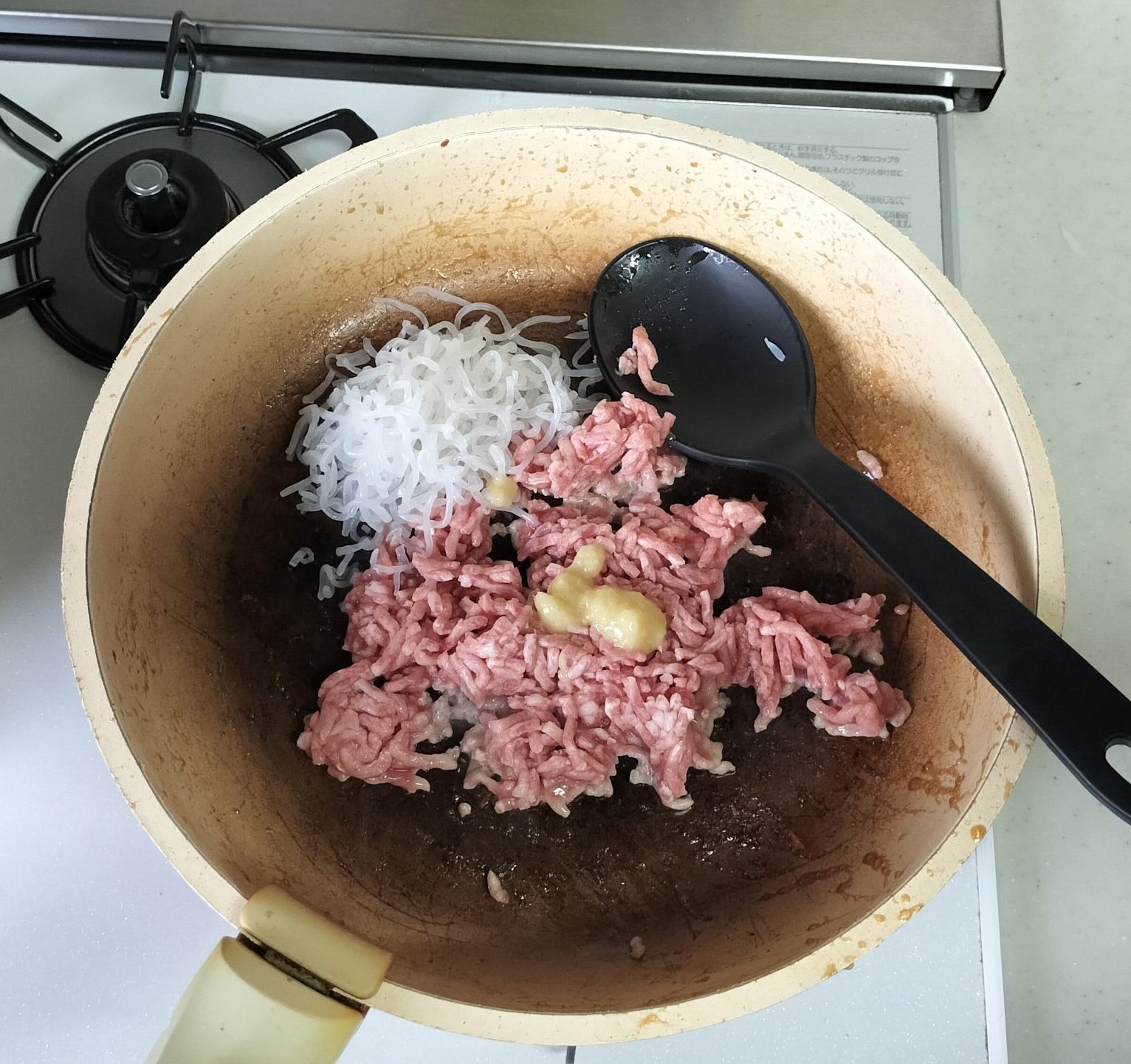 フライパンをそのまま使ってしらたき入り肉そぼろを作ります。